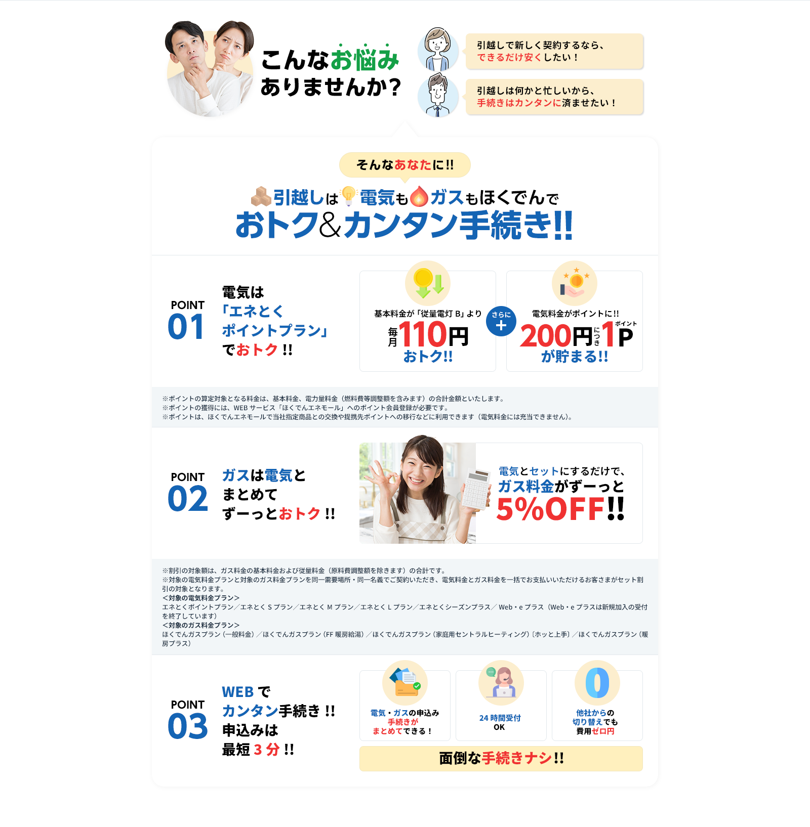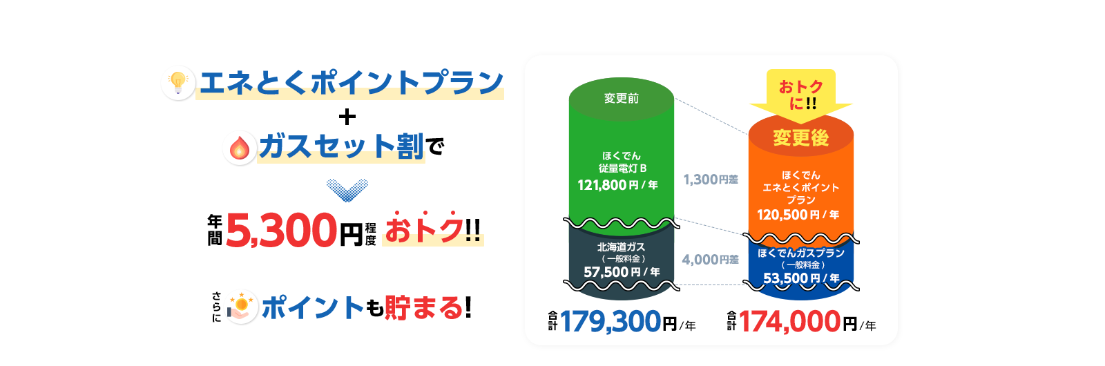 ※ガスのご契約が北海道ガス(一般料金)で毎月のガスご使用量が20 m³、かつ電気のご契約が当社(従量電灯B・30A)で毎月の電気ご使用量が230kWhのお客さまが、ガスを当社との契約、電気をエネとくポイントプランに切り替えていただいた場合